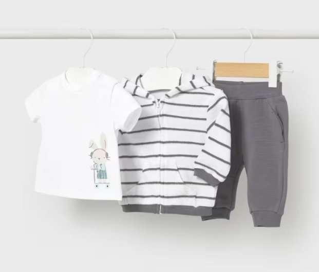 compuesto de chaqueta , camiseta de manga corta y pantalón ,en las tallas 4/6 , 6/9 y 12 meses