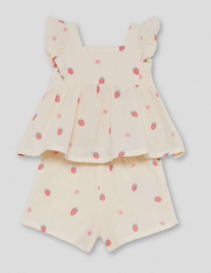 conjunto en tono crudo con dibujo de fresas en las tallas 18 meses y 4 años